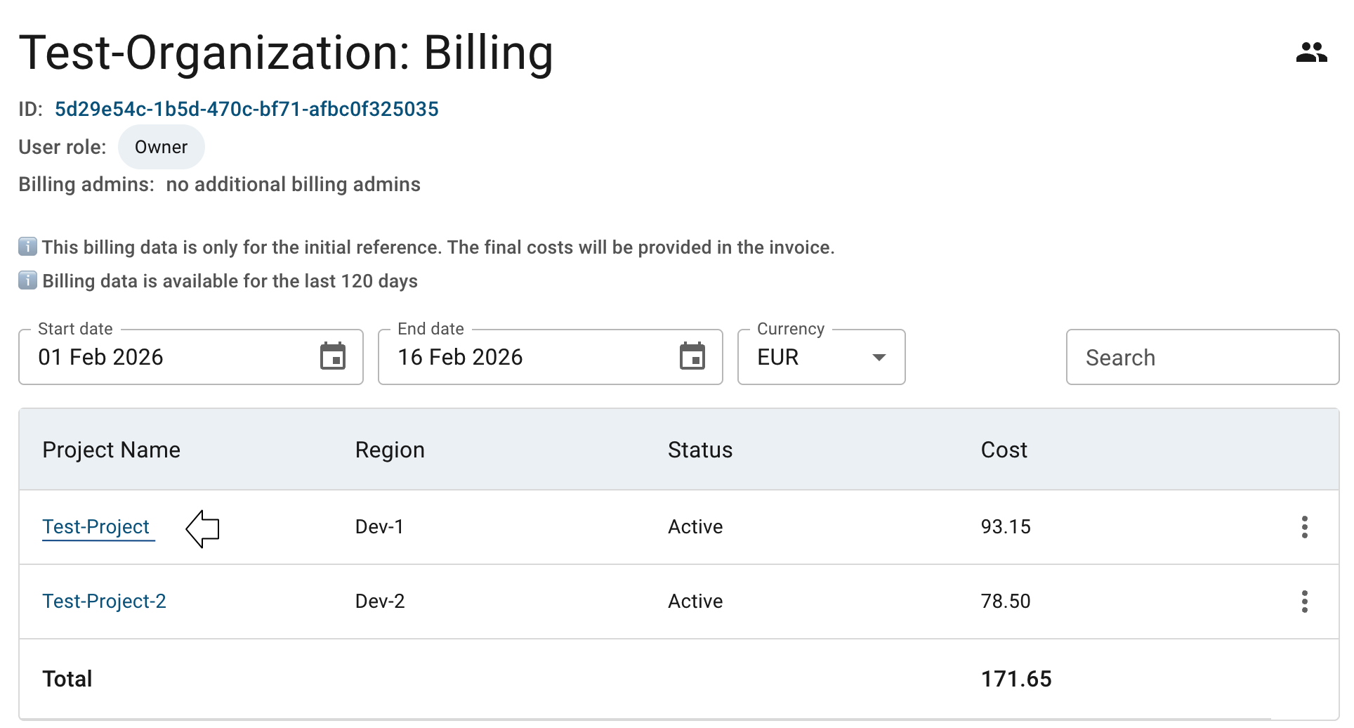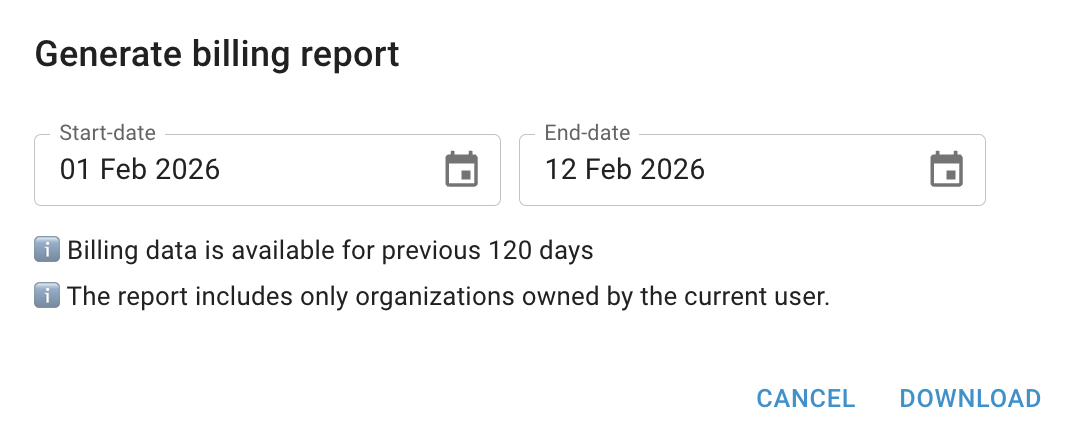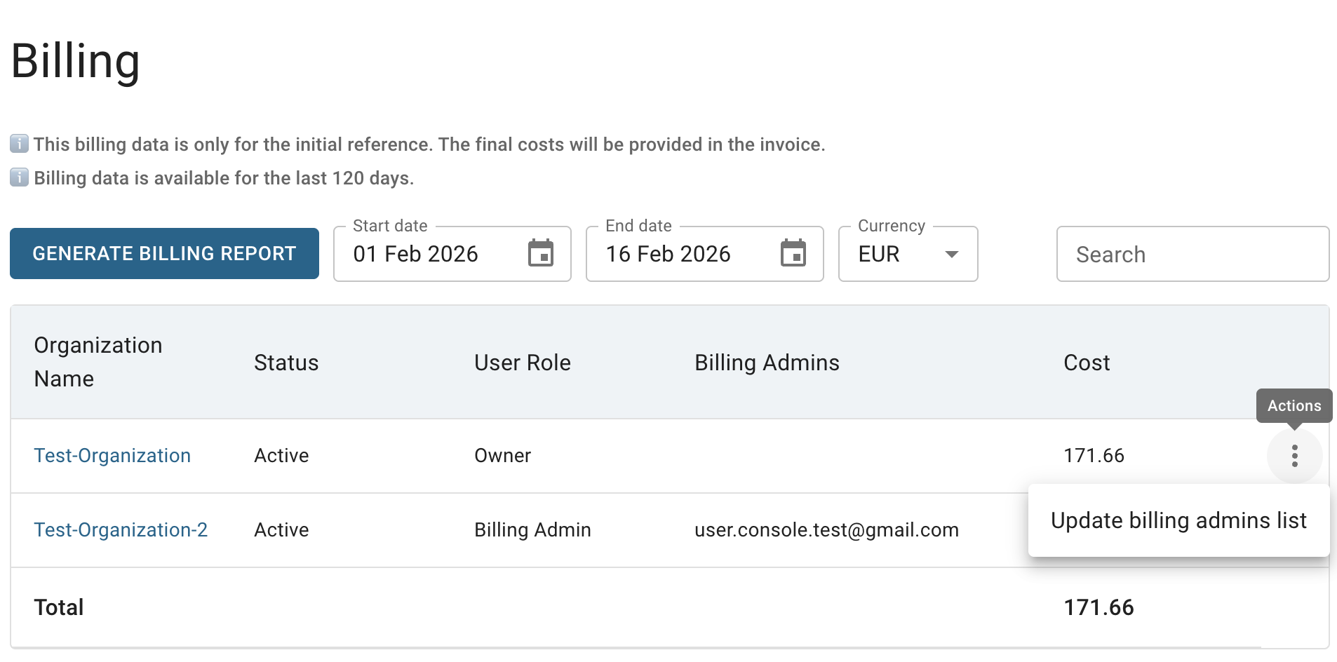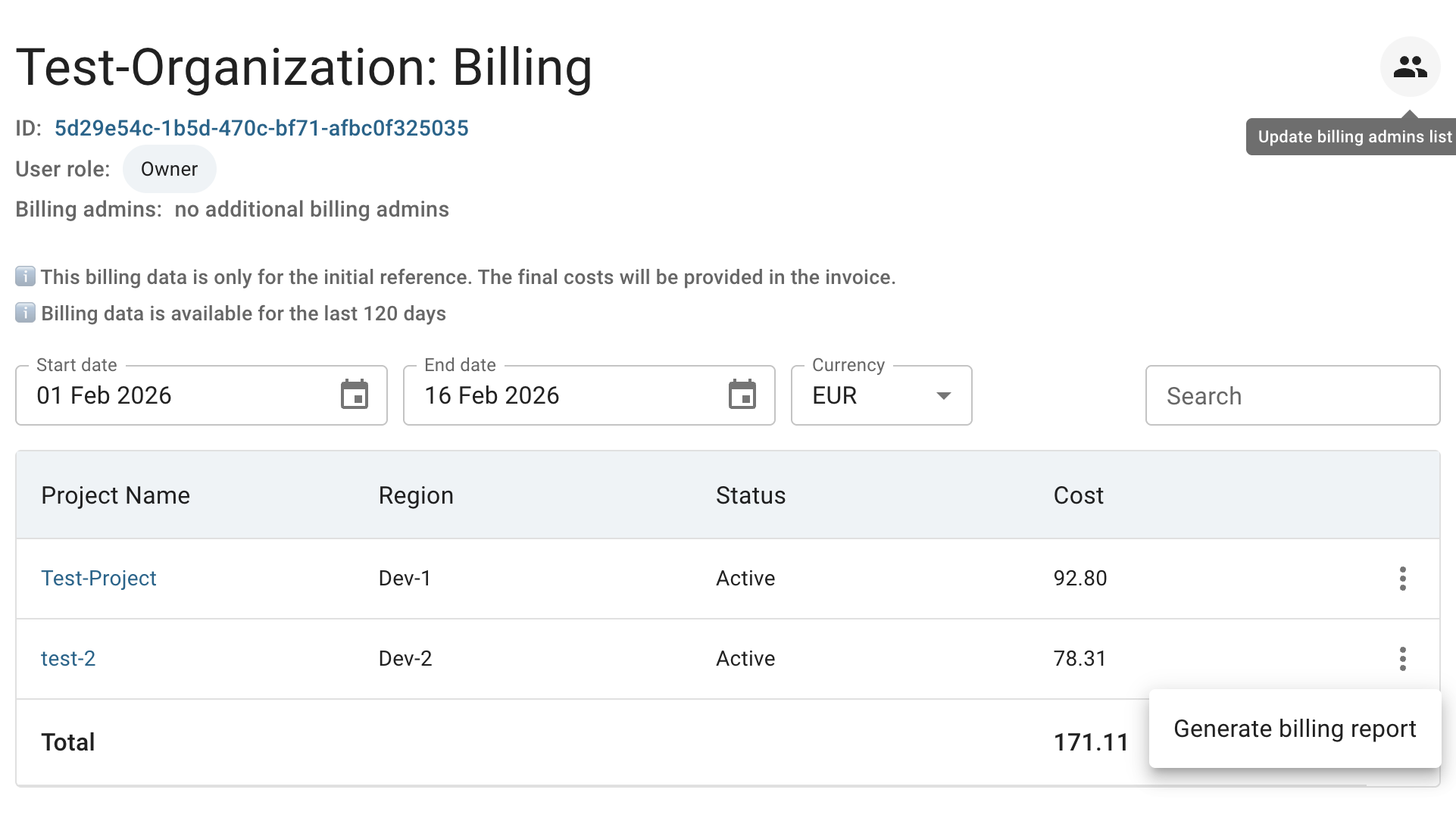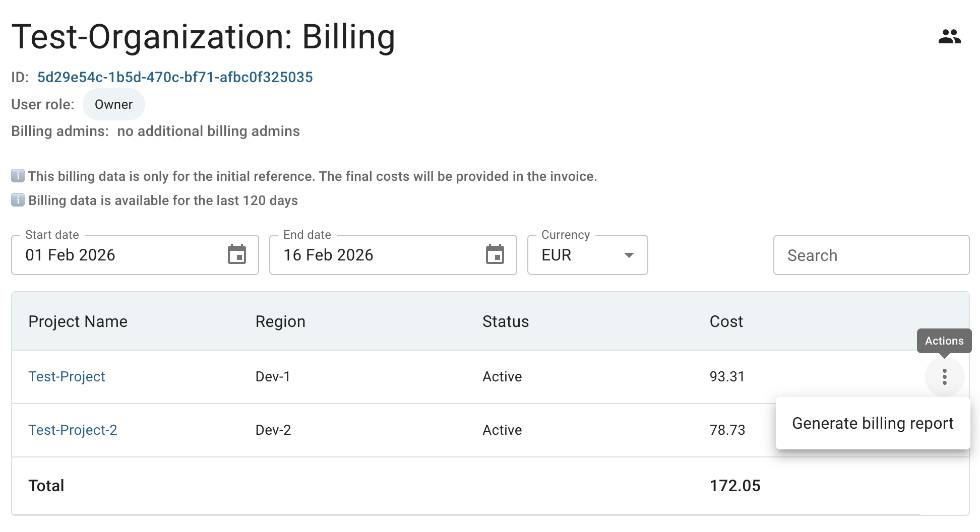Also, you can generate a detailed billing report for a specific Project directly from the Organization Billing Overview page by clicking the actions icon and selecting the Generate billing report option for the corresponding Project: