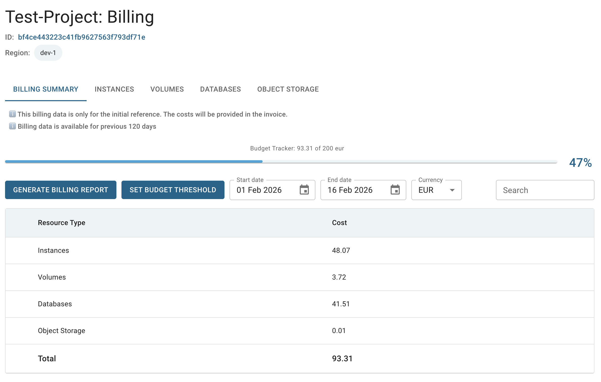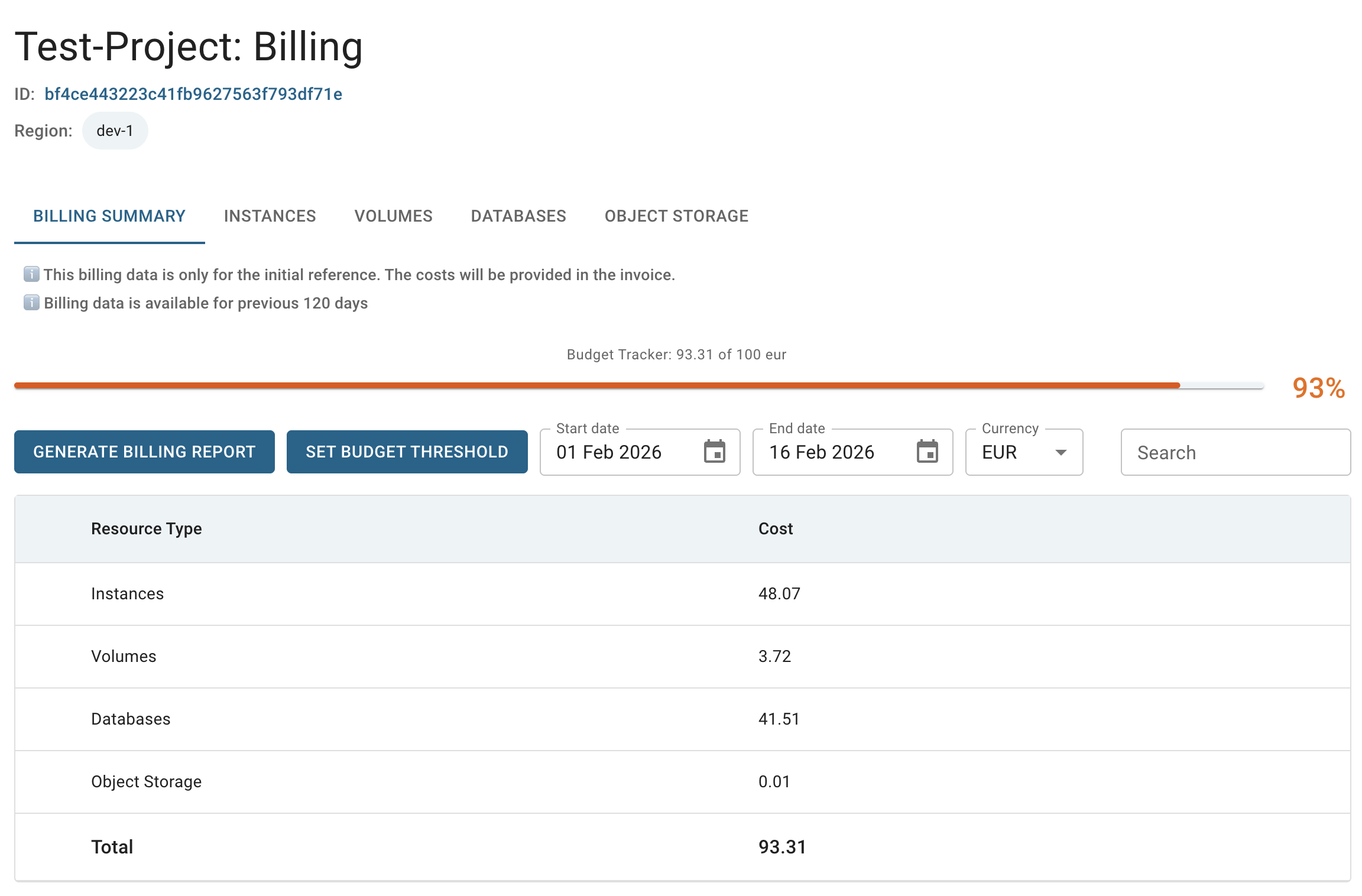 This report provides a detailed, project-level breakdown of costs by resource type, including instances, volumes, object storage, and other available components.