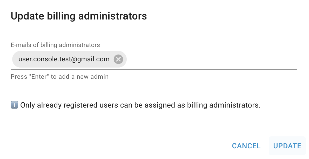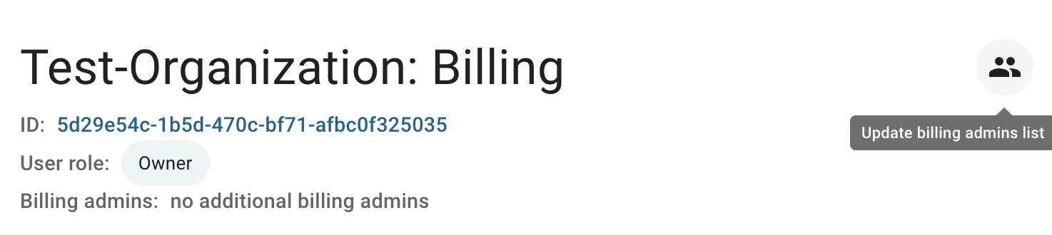 Also, you can update the Billing Administrator list directly from the Organization Billing Overview page by clicking on the corresponding quick actions icon there:
