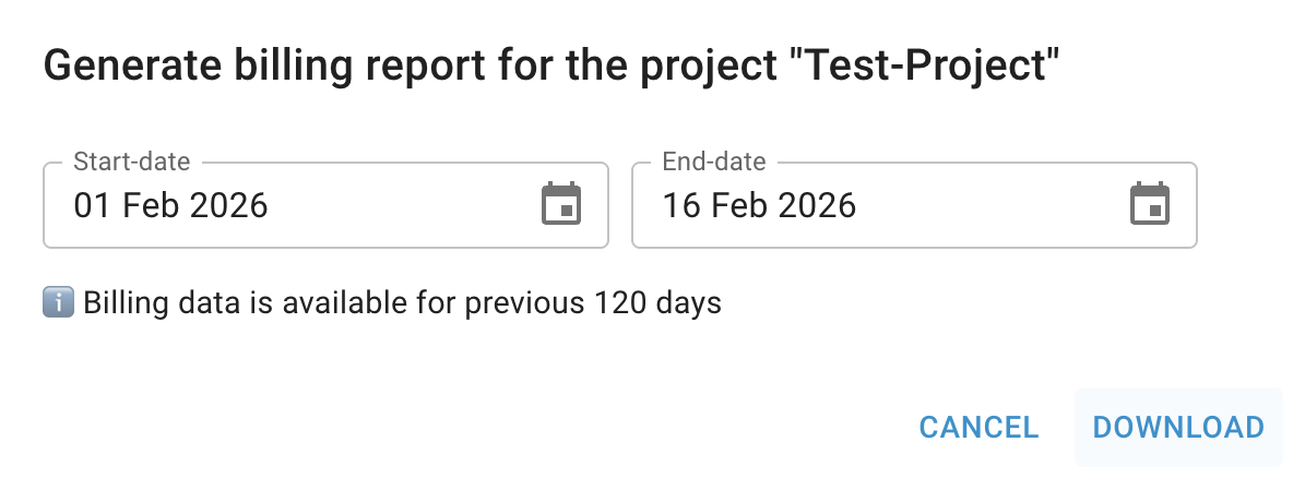 To obtain a detailed billing report for a specific Project, generate it from the corresponding Project Billing Overview page.