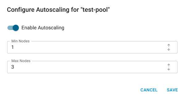 - select the option to enable or disable the Autoscaling for the selected Node Pool on the opened Autoscaling Node Pool window or change the minimum and maximum node count and click on the SAVE icon: