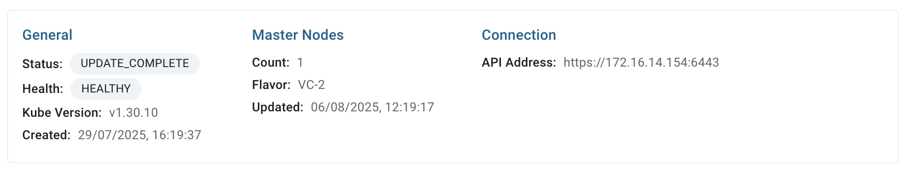 - Cluster details area with actual information about it - Status, Health, Kube Version, Created timestamp; Current Master Nodes count, Flavor and Connection section with API Address: