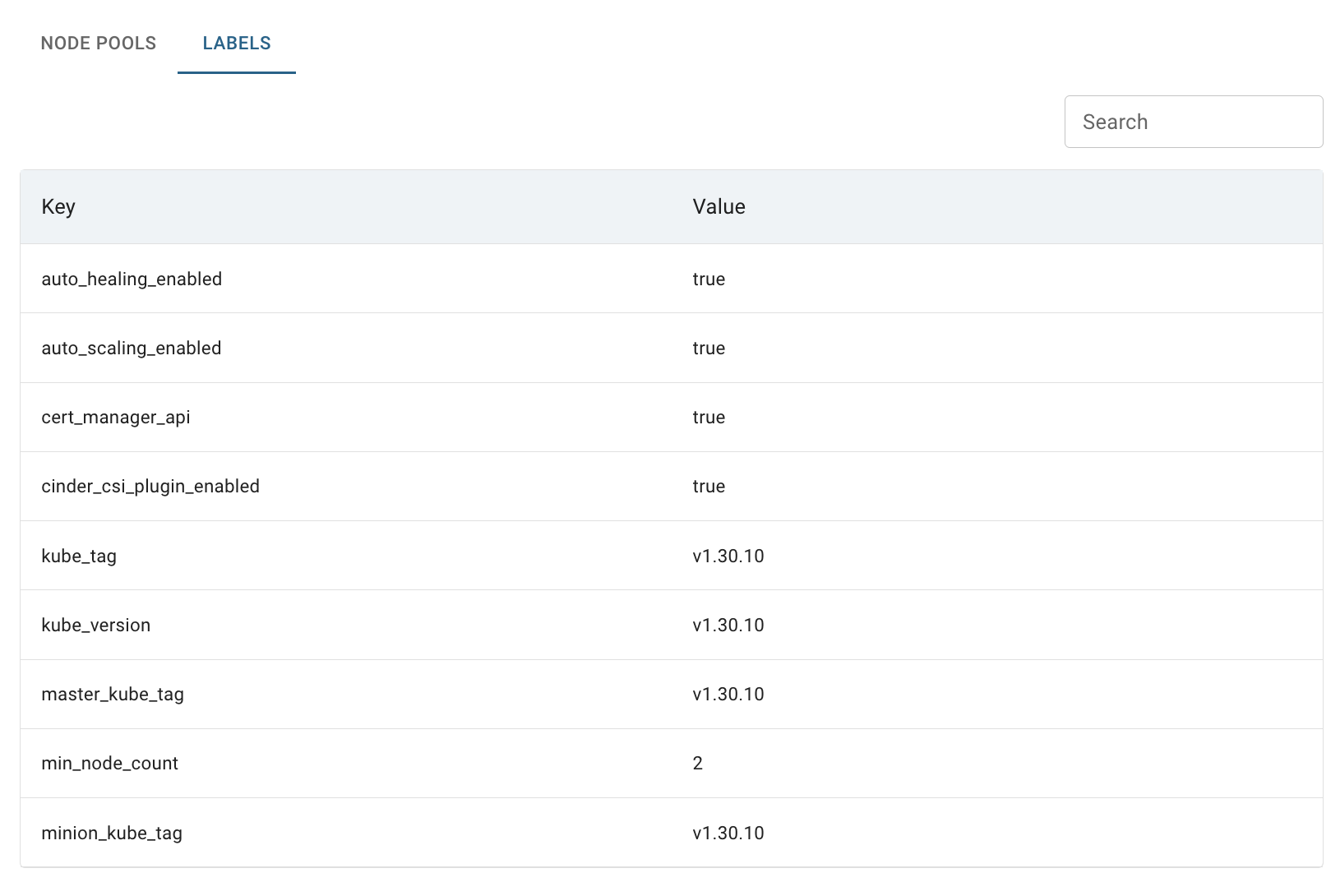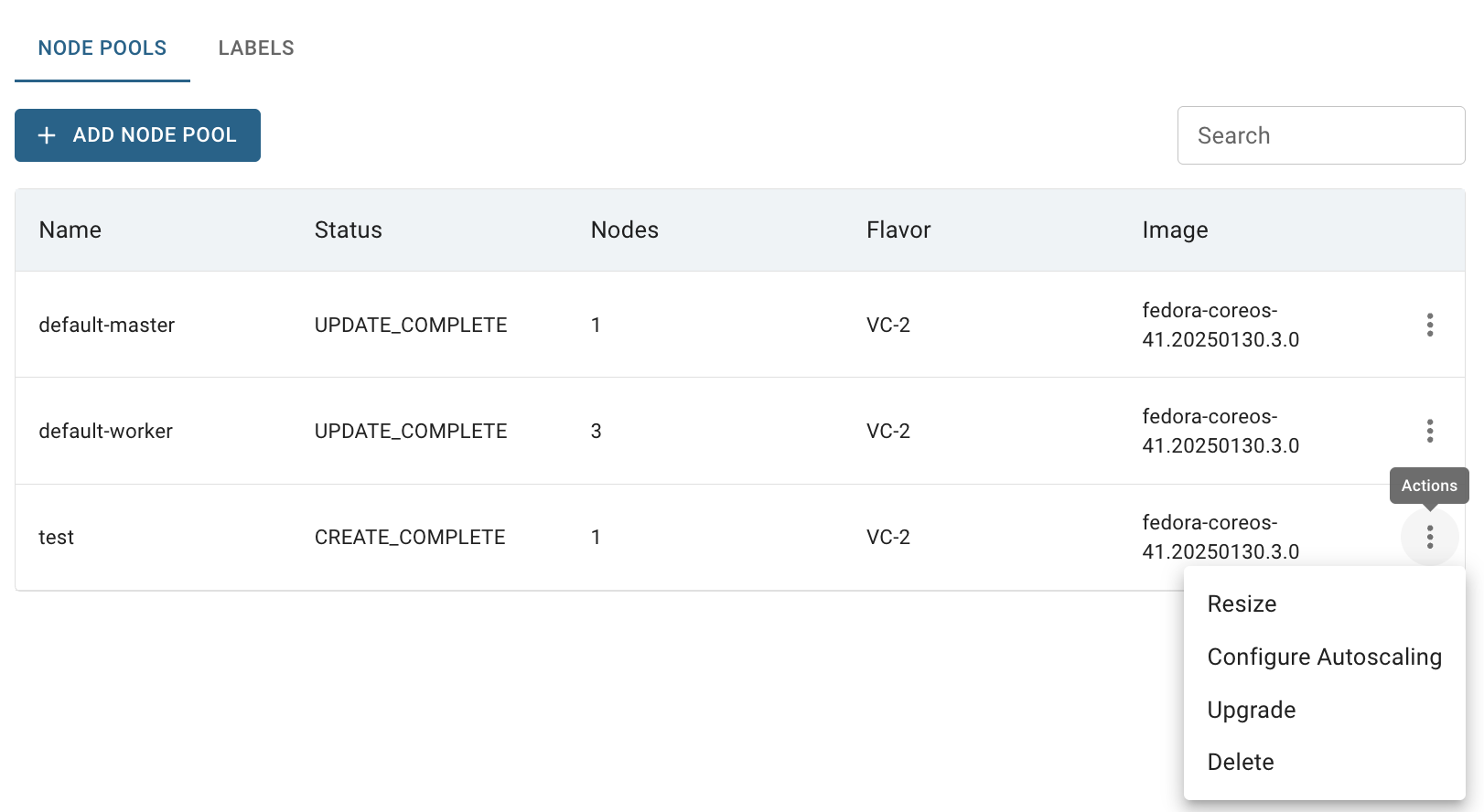 NODE POOLS TAB - opens the Cluster Node Pools page where you can find all available Node Pools of corresponding Cluster with their details; add, delete, resize, and configure autoscaling for individual Node Pools.