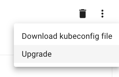 panel with available quick actions include management actions with this cluster such as: delete, download kubeconfig file and cluster upgrade: