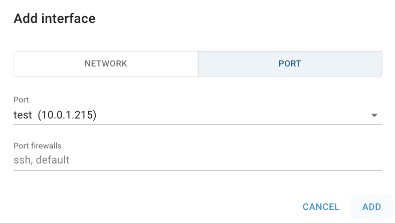 💡 You can add an interface to a Virtual Machine either by selecting a Network (to create a new port automatically) or by attaching an existing Port.