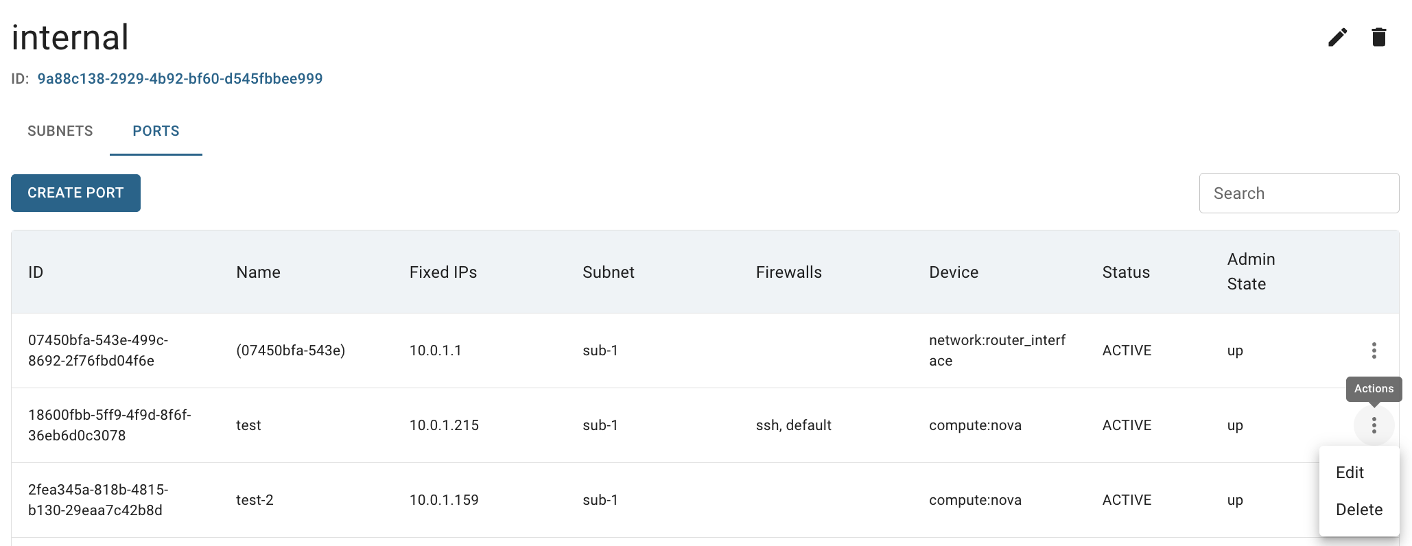 PORTS TAB - displays a list of all ports associated with the selected network, with available actions to create new port, edit, or delete an existing ones: