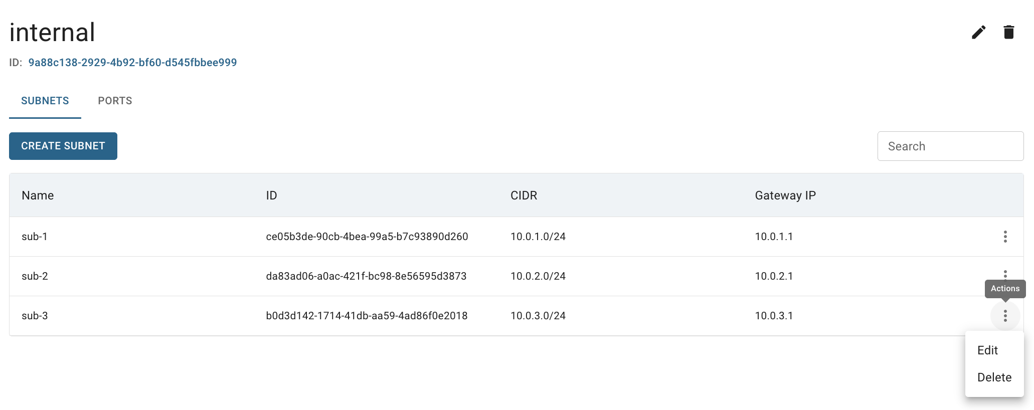 On this page you can find all created Subnets, related to the selected Network, with the Create button, Search bar and Actions icon, which opens a list of available management actions for the selected Subnet: