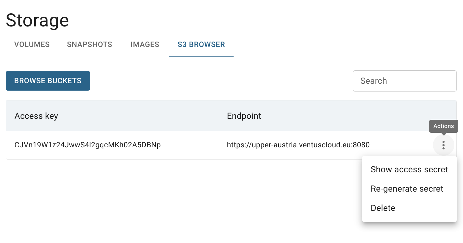 Once you have created the credentials, this button will change to the Browse Buckets button, which allows you to access and manage your existing buckets using the integrated S3 browser.